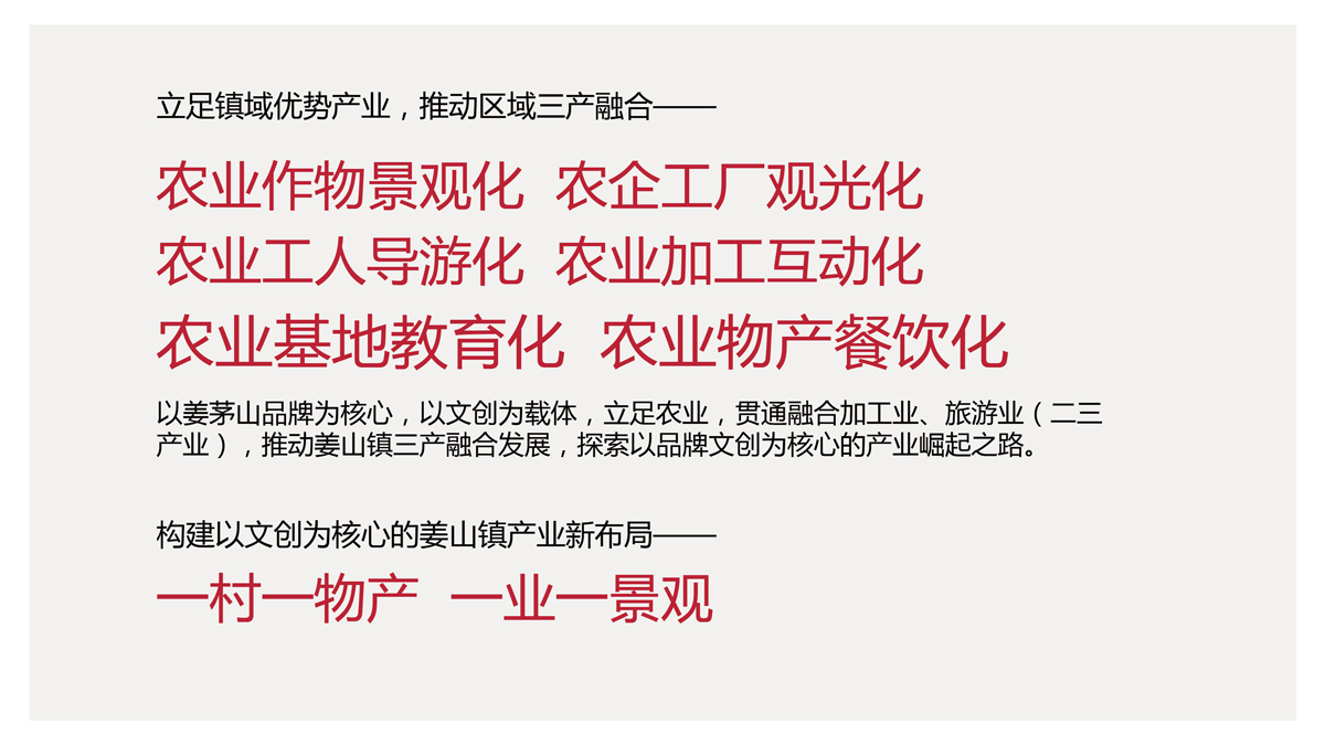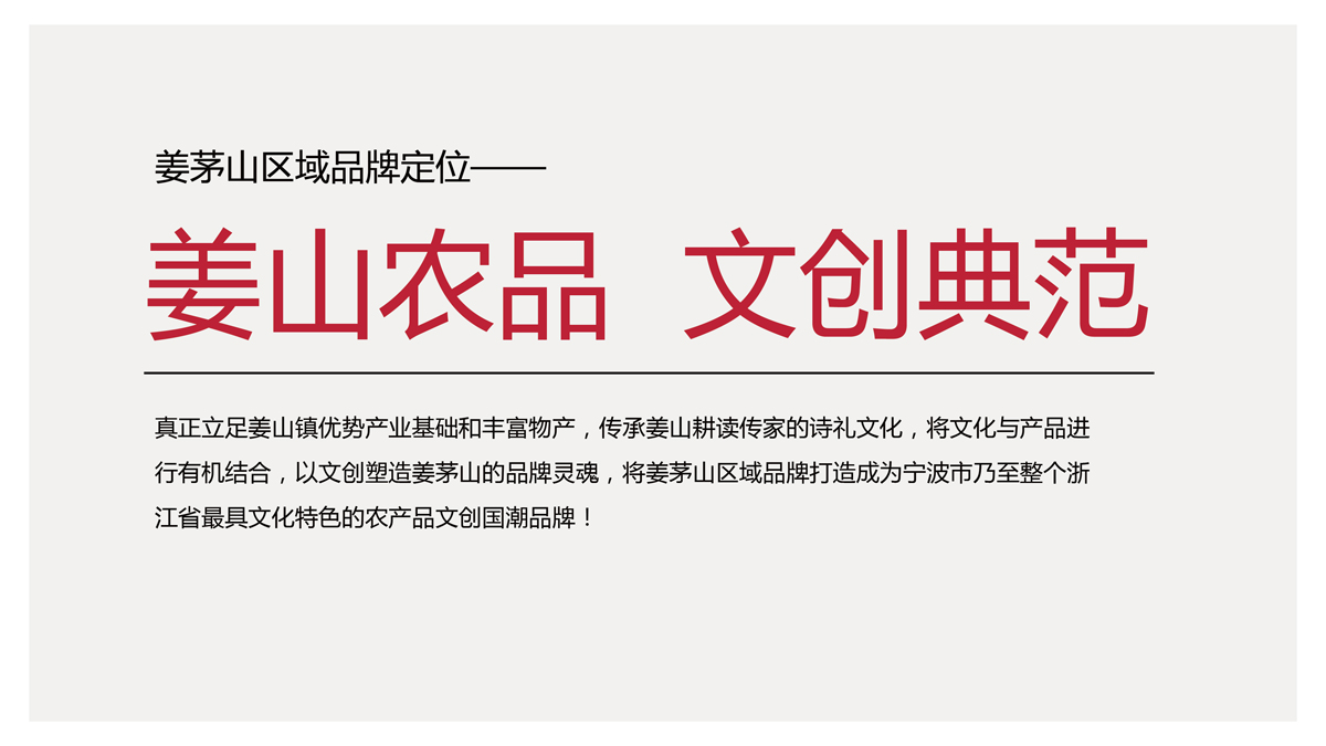 過程:立足姜山鎮(zhèn)“產(chǎn)業(yè)+品牌+文創(chuàng)”的發(fā)展新模式,取長補短,借勢發(fā)展,賦予姜茅山區(qū)域品牌新的內(nèi)生動力,聚焦姜山農(nóng)品,開創(chuàng)文創(chuàng)典范,與時代同頻,與消費共鳴,讓姜茅山區(qū)域品牌成為寧波人的驕傲,引領(lǐng)寧波文創(chuàng)農(nóng)產(chǎn)品的食尚潮流,開創(chuàng)寧波文創(chuàng)農(nóng)產(chǎn)品品牌新時代!