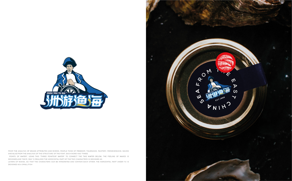 兩字中的橫設計成層層波浪,使字與字之間融會貫通、相互包容;漁下面的一橫設計成一條小魚,并將尾巴與海
